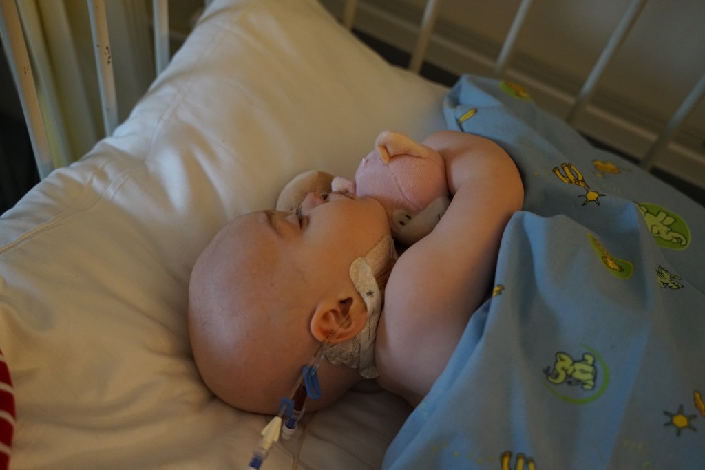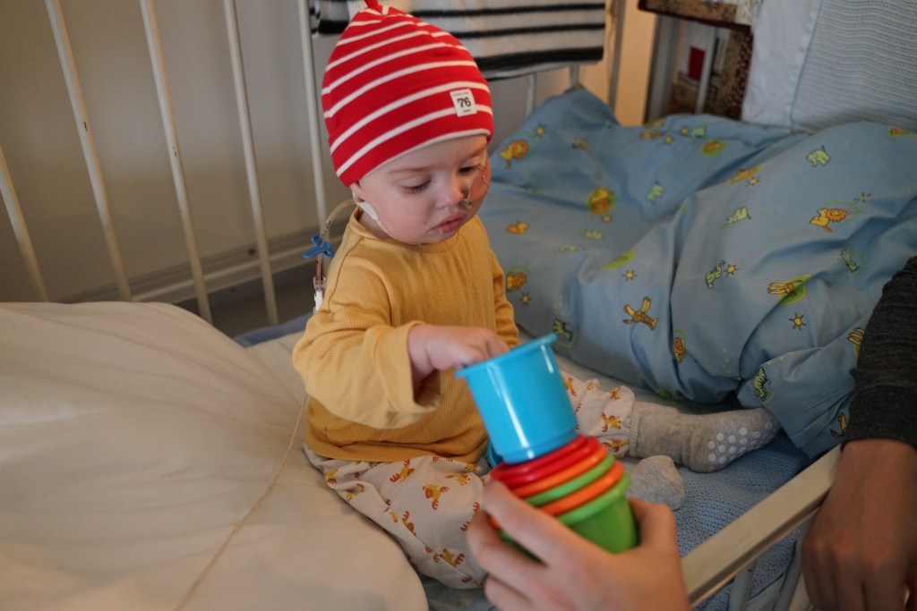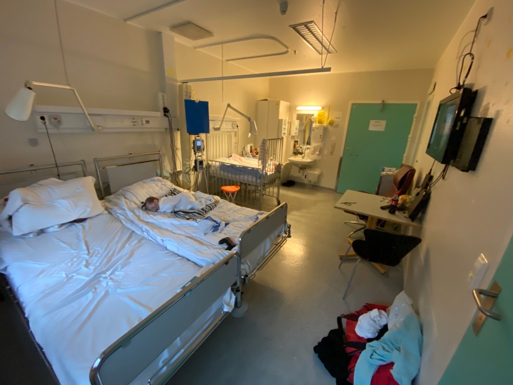 Temperaturen sjekkes regelmessig, så lenge den holder seg stabil er det ingen problem for oss å være hjemme, men om hun skulle stige og komme opp i 38 grader, må vi dra tilbake til sykehuset. Da er det mest sannsynlig starten på en infeksjon som må behandles raskt med antibiotika.